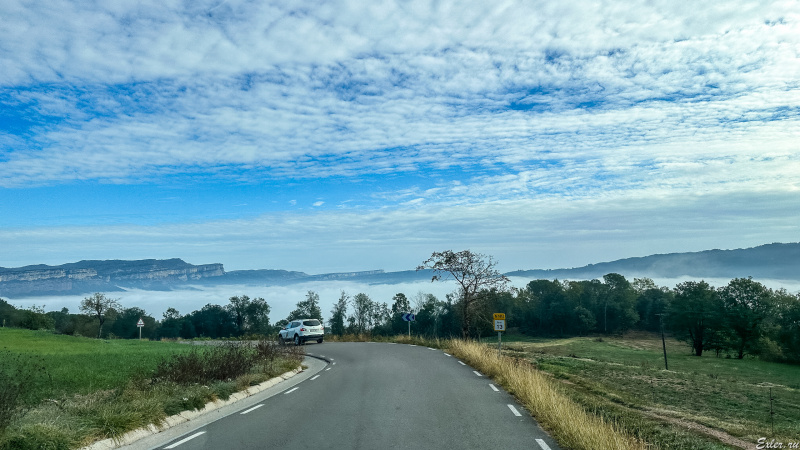 Подходим поближе. Туман очень эффектно лег на гору напротив. Минут через пятнадцать он развеется: нам повезло, что успели застать.