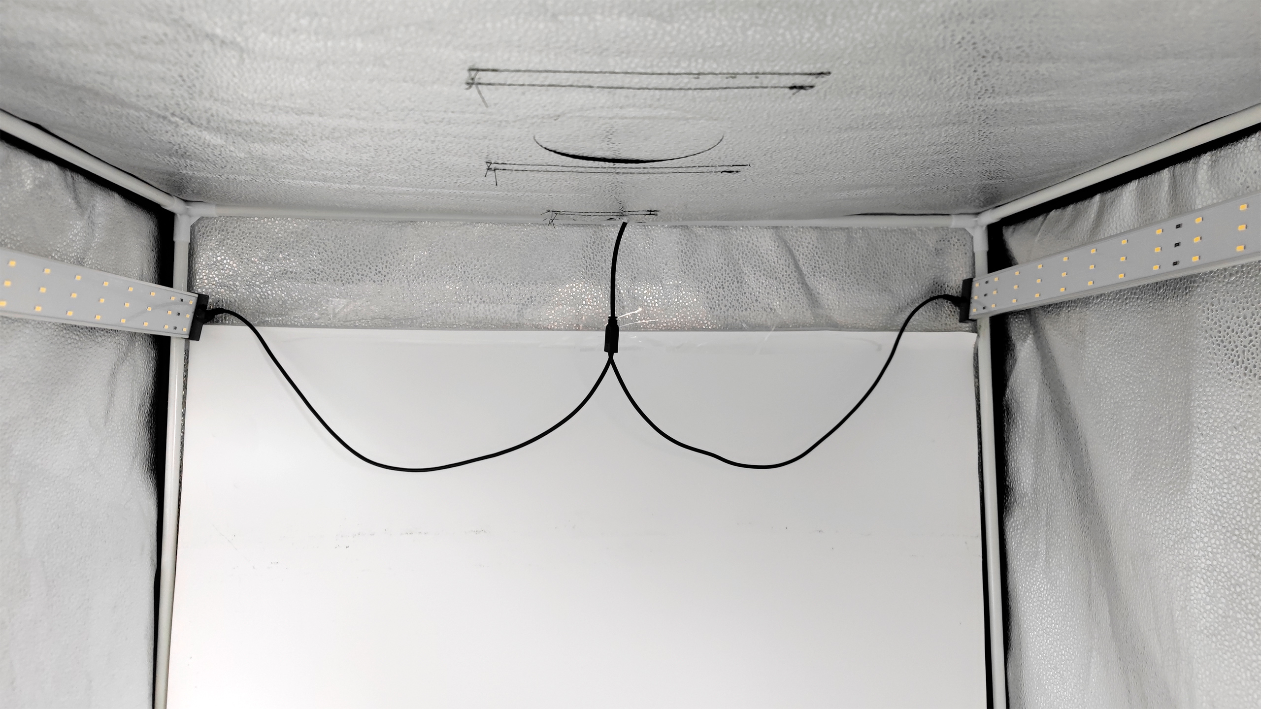 Я перепробовал много фотобоксов. В конце концов просто снял одну полку в шкафу купе, обклеил пространство белой самоклейкой и прикрутил эти лампы для освещения