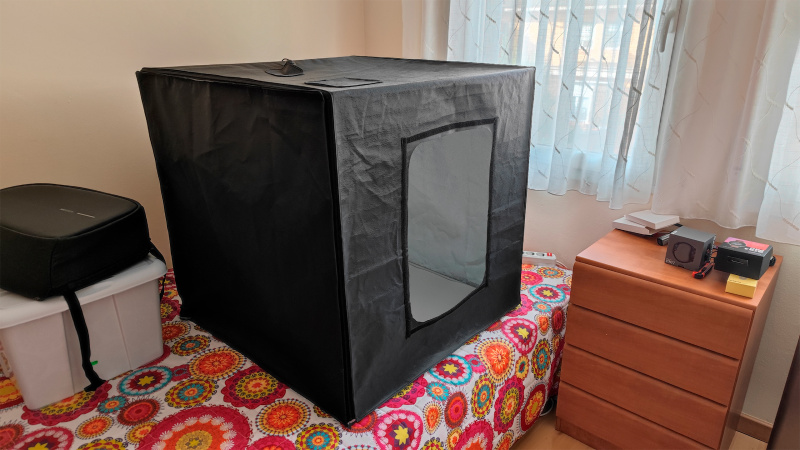 Есть у меня софтбокс для съемки гаджетов - что-то вроде вот этого. Он удобный. Во-первых, разборный, что периодически бывает нужно, когда приезжают гости. Во-вторых, он с обычными LED-лампами, а не с лампами-вспышками. В-третьих, он достаточно большой. (У меня до этого был софтбокс меньшего размера, и я с ним намаялся.)