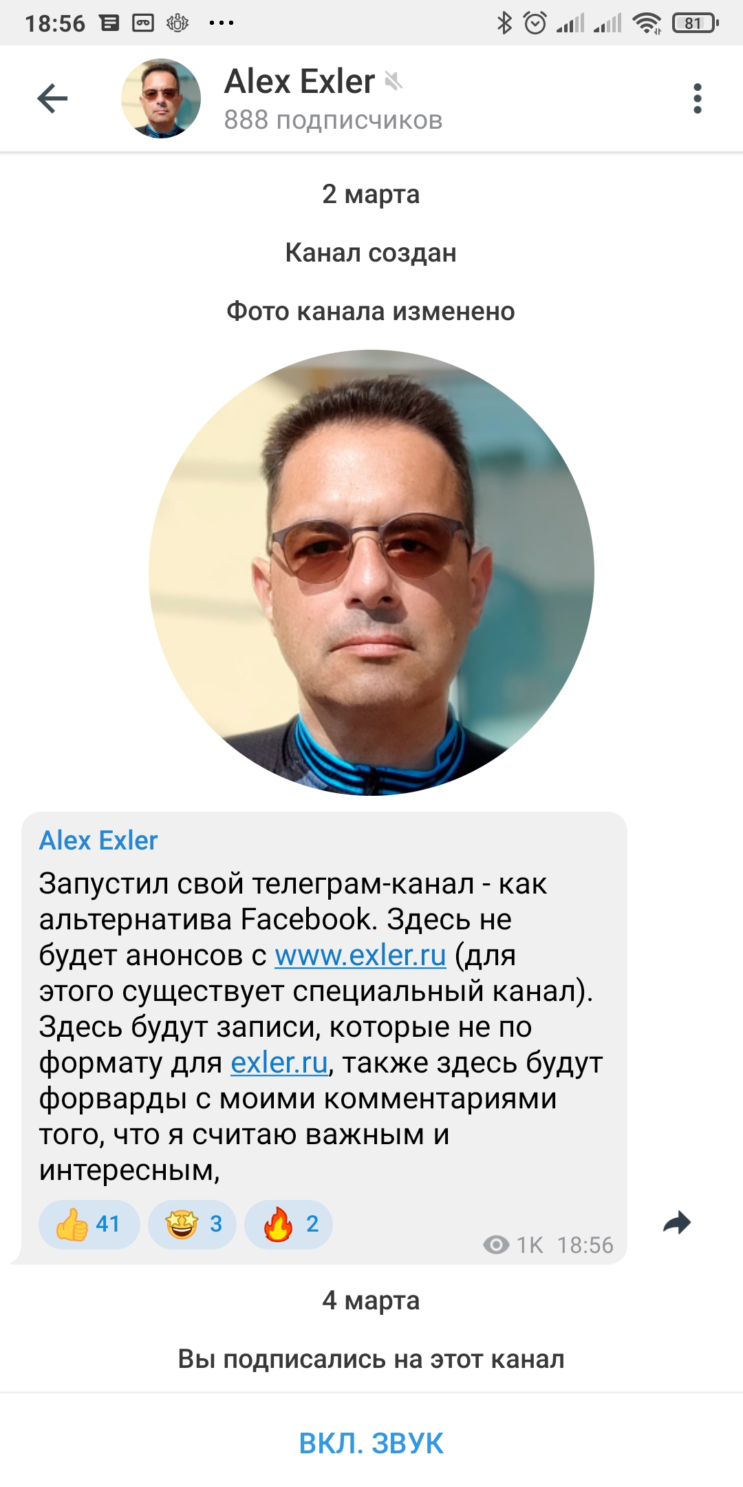 У меня не было своего персонального телеграм-канала - как-то было без надобности. Есть телеграм-канал Exler.ru, куда идут анонсы публикаций на сайте.