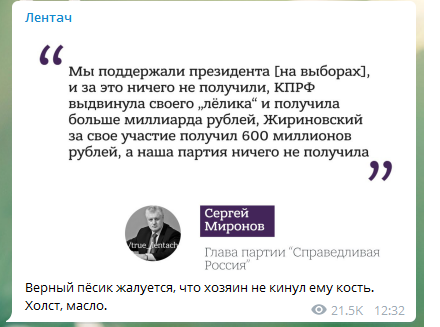 Миронов связал финансовые трудности с тем, что партия не выдвигала своего кандидата на выборы президента в 2018 году. «Мы поддержали президента (на выборах), и за это ничего не получили, КПРФ выдвинула своего „лёлика“ и получила больше миллиарда рублей, Жириновский за свое участие получил 600 миллионов рублей, а наша партия ничего не получила», — заявил Миронов. (Отсюда.)