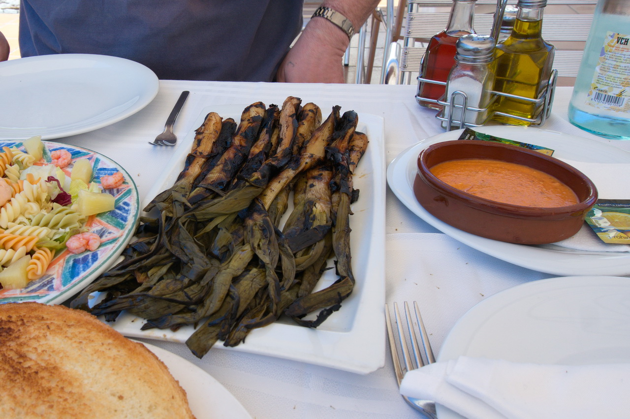 В Каталонии есть вот такое очень популярное блюдо - жареный на гриле стрельчатый лук. Выглядит он, на мой взгляд, не слишком аппетитно. Употреблять его полагается непременно руками, макая лук в специальный соус. Вместе с луком подаются специальные влажные салфетки для вытирания рук. Стоит это блюдо, что характерно, довольно дорого - порядка 11 евро. Ну, в общем, есть его можно, но я бы не сказал, что там идет речь о божественном, восхитительном вкусе. Например, репчатый лук, поджаренный на гриле или запеченый, мне нравится заметно больше. А каталаны от вот такого лука прям с ума сходят - любимое блюдо, во всех ресторанах подается.