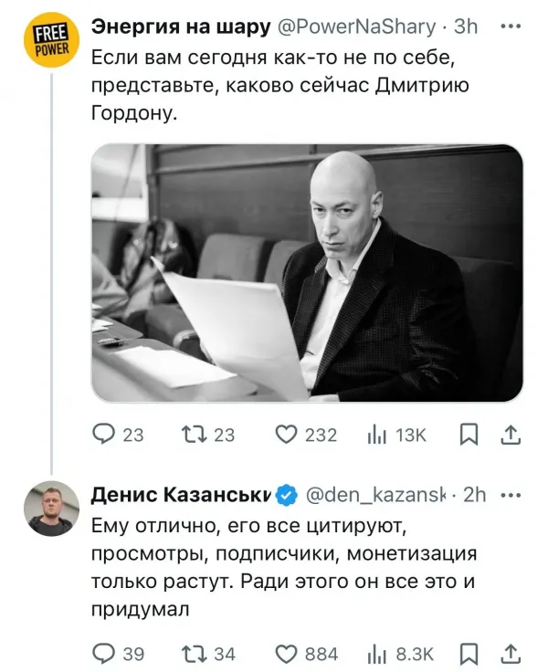 Бог с ними, с пирамидками. Все про его методы работы с информацией я понял после эфира с ним в качестве гостя после того, как он взял интервью у Гиркина. Интервью, напомню, было спецоперацией, к которой Гордон страшно тщательно готовился (с его слов).