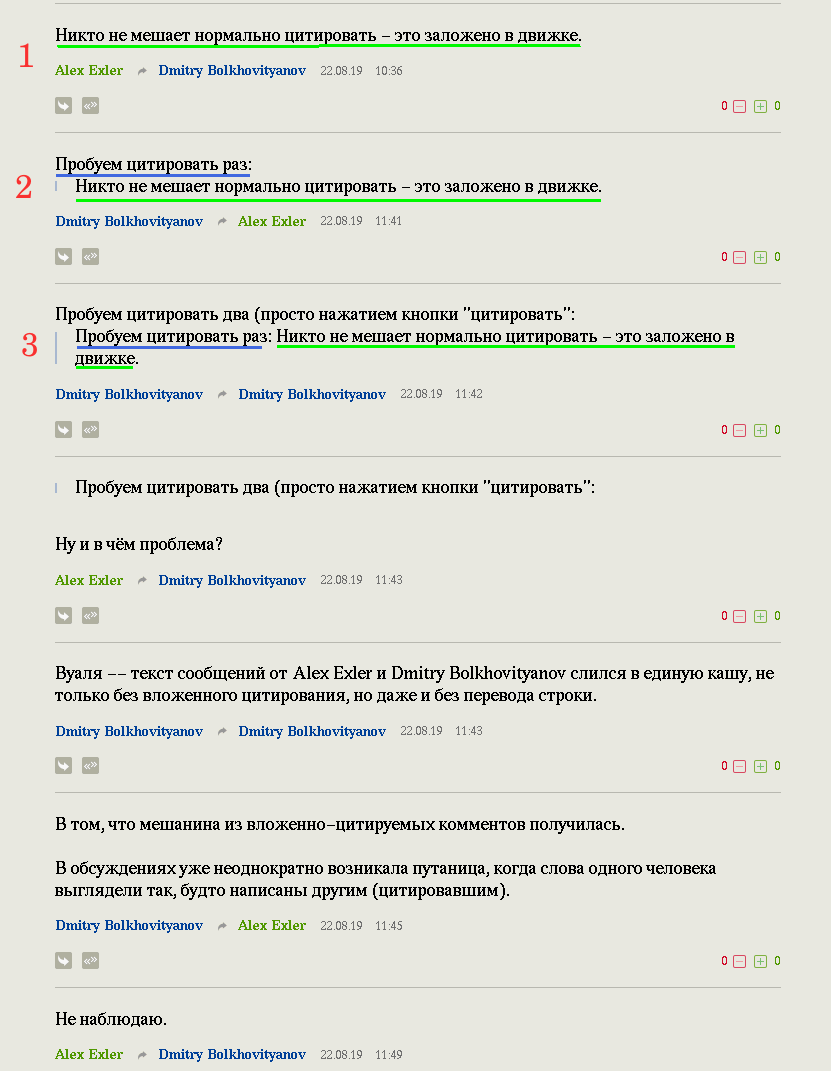 И, кстати, в сообщении 3 напрочь отсутствует упоминание об авторе цитаты из сообщения 1 (Alex Exler), а выглядит так, что всё написано автором сообщения 2 (Dmitry Bolkhovityanov).