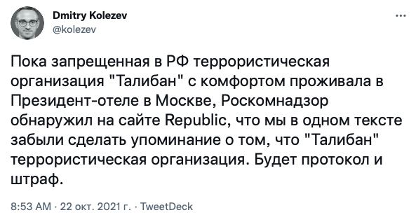 Тем не менее мы знаем, что талибы это все делали исключительно из лучших побуждений. Просто чтобы улучшить качество жизни афганцев. Что говорите? Что у меня слегка крыша уехала, раз я пишу такие вещи? Ну, у меня-то крыша пока на месте, а вот у официальной представительницы МИД РФ крыша, похоже, совсем уже прохудилась.