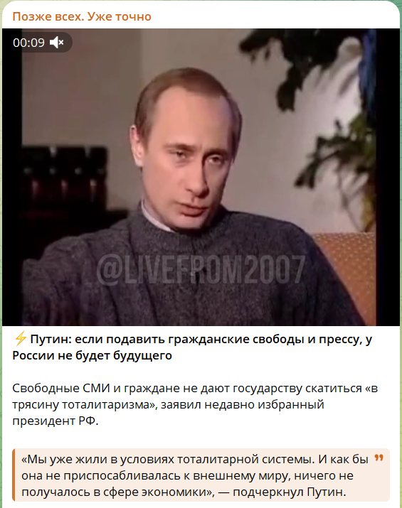 Я поражаюсь одной вещи. Недавно с детьми смотрел старый советский фильм - "Королевство Кривых Зеркал". Так там как раз было про то, что если власти - мудаки, которые создали альтернативную реальность (понавешали кривые зеркала), то эту самую альтернативную реальность советская идеалогия предлагала игнорировать и говорить властям правду об их мудачестве. А современная рашка будучи копией этого Королевства Кривых Зеркал получается в ценностях свободы слова даже пробила дно относительно советского союза. В совке люди были более свободные и свободолюбивые чем сейчас. Как народ на это пошёл? Я не верю в генетические дефекты целого народа, ибо это фашизм, но результат то мы видим - целая страна дегенератов, за редким исключением нормальных, которые или свалили и сидят.