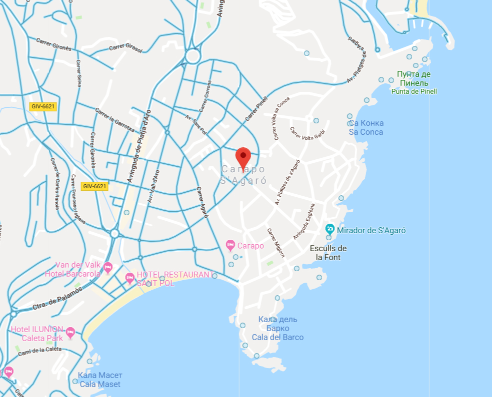 Впрочем, с неимоверным удивлением выяснил, что в Гугле действительно нет снимков прибрежной зоны. Почему - непонятно совершенно, ездить там можно свободно, я ставил машину на парковке у самого пляжа, как раз рядом со шлагбаумом перед Hostal de la Gavina.