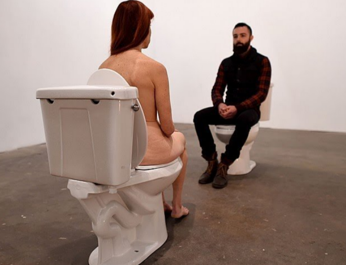 "Апогеем этого перформативного мракобесия стала двухдневная акция 59-летней американки Лизы Леви. Она сидела голой на унитазе посреди галереи. Напротив нее был установлен еще один унитаз, на который мог присесть любой зритель. Гостям запрещалось говорить с художницей и трогать ее - только смотреть (в этом можно увидеть кивок в сторону одной из самых знаменитых акций Марины Абрамович "Наедине с художником"). Вы спросите, в чем глубинный смысл этого перформанса?