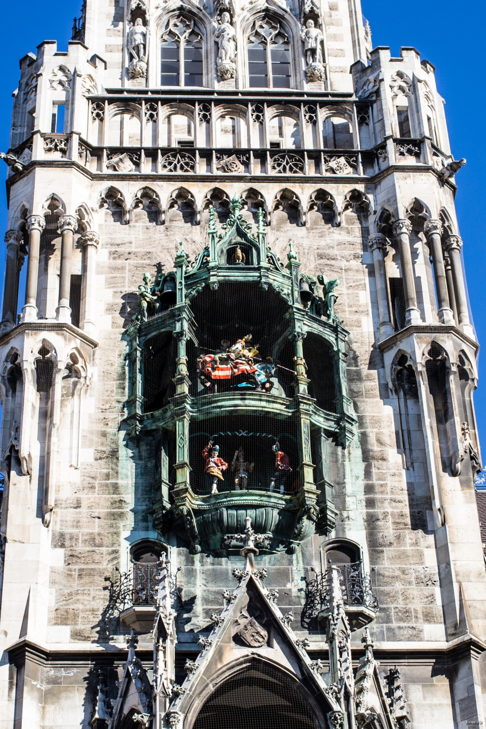 В 11 часов (летом в 12 и 17 часов) начинают бить 43 колокола часового механизма и 32 фигурки разыгрывают сценки из жизни Мюнхена. На площади при этом скапливаются полчища туристов и почти все они снимают это волнующее действо на смартфоны и планшеты. Ведь согласитесь, как приятно потом посмотреть дома, как эти фигурки дрожат и прыгают из-за тряски смартфона в руке.