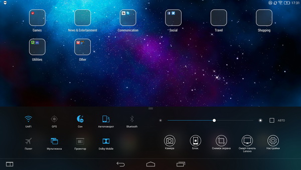 Здесь установлена операционная система Androd 4.4.2, снабженная оболочкой и системными приложениями разработки Lenovo. (Замечу также, что оболочка, разработанная для планшетов, очень заметно отличается от их телефонной оболочки.)