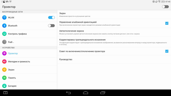 Пикопроектор - одна из главных фишек этого планшета. Тут используется технология DLP, проектор проецирует изображение с разрешением WVGA (854×480) на любую ровную поверхность.