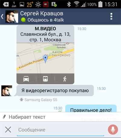 Это сама по себе полезная возможность, присутствующая в некоторых других мессенджерах, но в 4talk сделано намного более удобно: на переданной координате можно выбрать задание маршрута на машине, общественном транспорте или пешком - чтобы сразу получить навигационный маршрут через карты Google и навигацию Google.