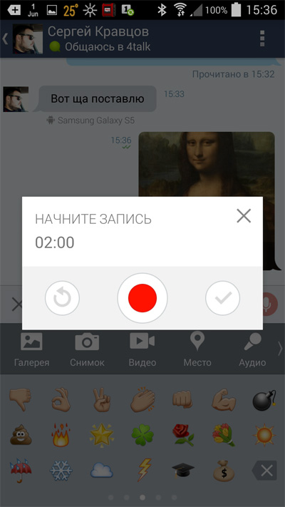 Рядом с полем отправки сообщения есть значок микрофона: 4talk можно настроить так, что при нажатии на микрофон автоматически начинается запись голоса.