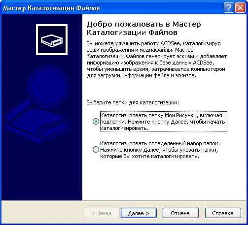 При первом запуске лицензионная версия ACDSee потребует активации через Интернет (аналогично Windows XP), чтобы вы могли задействовать все ее функциональные возможности. Далее программа может предложить вам автоматически скачать и установить какие-то свои обновления, которые доступны на ее сайте, – это вполне имеет смысл сделать. Ну а после этого сразу появится вопрос о создании каталога изображений с помощью мастера создания каталога: