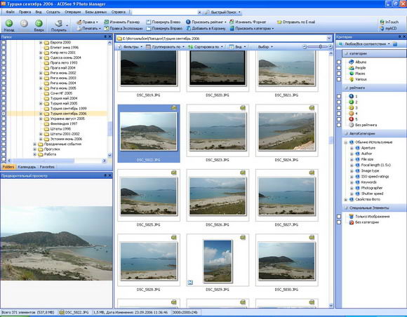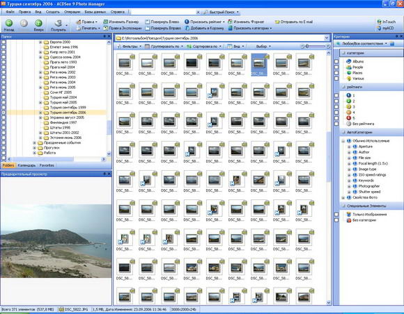 Сортировка. Файлы в папке можно сортировать любым удобным вам способом. Причем не только по стандартным параметрам (имя, размер, дата создания, тип), но и по специфическим для ACDSee: свойство изображения, рейтинг, атрибуты, ключевые слова, примечания и многое, многое другое.