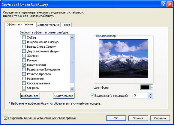 Как видите, здесь можно настроить всевозможные эффекты смены изображений, цвет фона экрана и задержку в секундах перехода между картинками. Если выбрать несколько разных эффектов перехода, они будут применяться случайным образом.