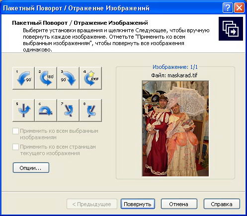 Обратите внимание на опцию «Применить ко всем выбранным изображениям» – это даст команду обработать все выбранные фотографии. Если нажать на кнопку «Опции», то там можно задать всякие дополнительные варианты действий (например, при развороте переименовать изображения или дополнительно сжать их). Что удобно, по умолчанию ACDSee после разворота сохраняет изображения с теми же именами, что у них и были.