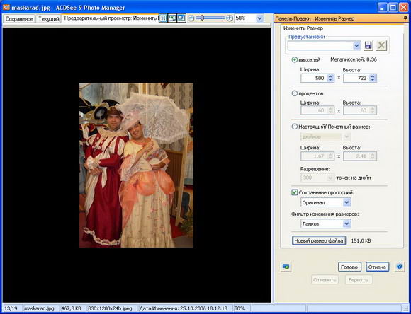 Теперь нам нужно пропорционально уменьшить фотографию по ширине. (Мы уже говорили о том, что для пересылки изображения через Интернет желательно уменьшать его до 500 пикселей по ширине.) Для этого вызывается пункт меню «Изменить – Изменить размер» (Ctrl+R). Перед вами снова появится окно редактирования, но только уже с панелью изменения размера: