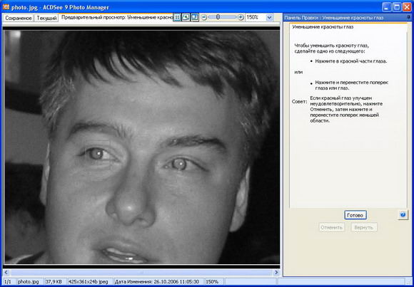 ACDSee также умеет убирать эффект «красных глаз», причем делает это гораздо эффективнее, чем IrfanView. Давайте посмотрим, как это делается.