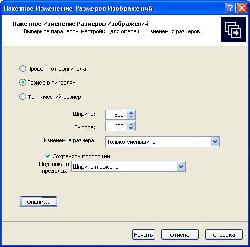 Внимание! Обратите внимание на то, что значения ширины и высоты, которые задаются в данном окне, вовсе не означают четкий размер каждой фотографии. Например, 500 по ширине и 600 по высоте говорит о том, что полученные фотографии будут не больше 500 пикселей по ширине и 600 по высоте. То есть изменение размера делается достаточно интеллектуально: по-разному для портретного и альбомного расположения изображений. Поэтому на самом деле лучше в значениях ширины и высоты указывать одинаковые параметры: или 500, или 600 в обоих полях.