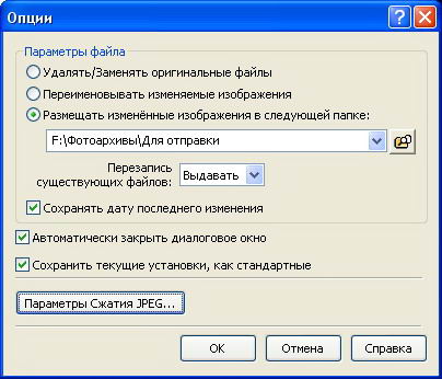 Лучше всего выбрать третий вариант (поместить модифицированные файлы в указанную папку) и указать, куда именно следует помещать изображения. Желательно также нажать кнопку «Параметры сжатия JPEG», чтобы задать новые параметры сжатия фотографий, и там выбрать 60-процентное качество – этого будет вполне достаточно.