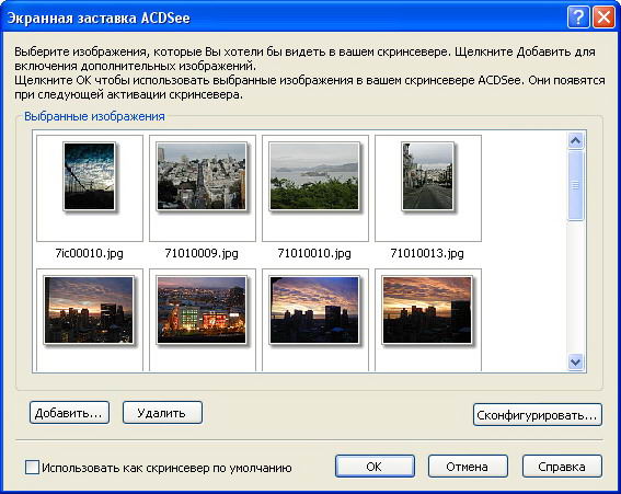 Здесь вам показывают выбранные для заставки фотографии. Если в набор нужно добавить еще какие-то изображения, нажмите кнопку «Добавить» – перед вами откроется соответствующее диалоговое окно, в котором можно выбрать различные файлы. Когда все будет подготовлено, нажмите кнопку «Сконфигурировать» – появится такое же диалоговое окно, как при настройке скринсейвера:
