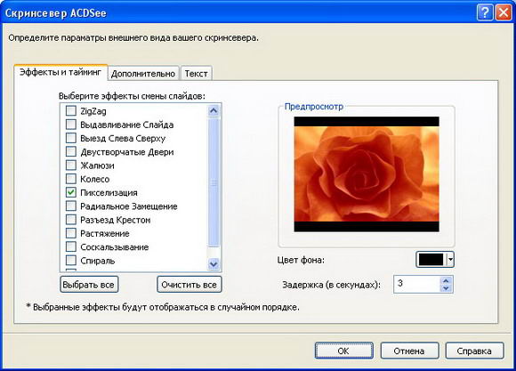 Запускаете ACDSee в режиме просмотра папок. Выбираете нужную папку (папки). Отмечаете там те фотографии, которые хотите включить в заставку. Далее выбираете пункт меню «Операции – Настроить экранную заставку» – перед вами появляется окно настройки заставки: