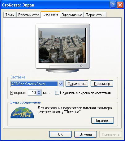 Теперь, если вы зайдете в настройки экранной заставки Windows XP, то увидите, что там появилась ваша заставка: