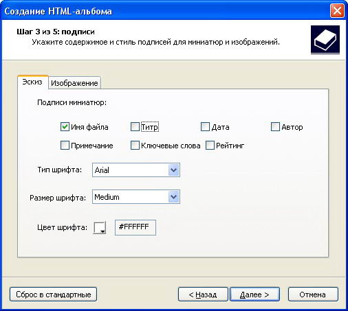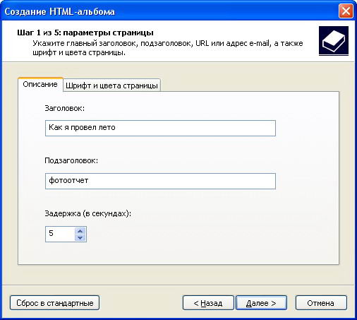 Заголовок альбома, подзаголовок и ссылка на интернетовскую страничку (например, на ваш домашний сайт). Здесь также можно задать вид шрифта для надписей, его цвет и так далее.