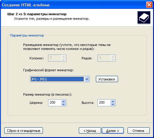 Далее задаются параметры эскизов. Если речь идет о фотографиях, то формату JPG (JPEG) альтернатив нет (при нажатии кнопки «Установки» можно задать уровень сжатия и другие параметры JPEG). Если выкладываются не фотографии, а, например, штриховые картинки, тогда можно в качестве формата эскизов выбрать GIF.