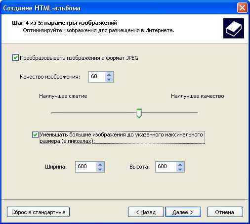 Опцию «Преобразовывать изображения в формат JPEG» включаем обязательно – мало ли, может, исходные картинки записаны в TIFF или BMP, а в этом случае они совершенно монстрообразного размера, который не годится для выкладывания в Интернет. Качество изображения можно поставить 60, если это самые обычные фотографии, но если речь идет о высокохудожественных изображениях с большим количеством мелких деталей, тогда значение лучше увеличить до 85. Впрочем, вы всегда потом можете посмотреть, что из всего этого получится, и при необходимости заново сгенерировать веб-страничку, изменив параметры качества картинок.