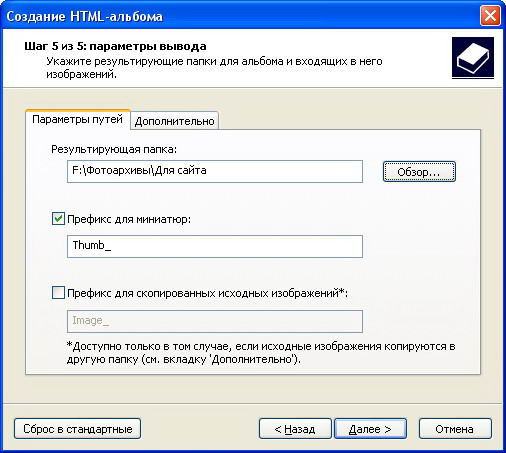 Здесь вы указываете, в какую папку сохранять подготовленную страничку, а также какой префикс добавить к имени эскизов и, возможно, самих обработанных фотографий. Папку, разумеется, лучше выбирать специально подготовленную для этой цели, чтобы потом не запутаться.