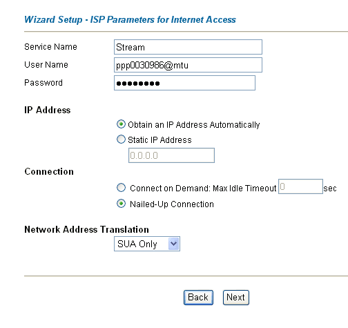 Нажимаем кнопку Next и попадаем в окно настройки PPoE клиента. (Напоминаю, что в режиме роутера модем сам работает PPPoE клиентом, а компьютеры локальной сети получают доступ в Интернет через NAT - трансляцию интернет-адресов.) Настраиваем все так, как приведено на рисунке, но в параметрах UserName и Password, разумеется, вы должны вписать ваши собственные параметры доступа к "Стриму". В строке Service Name можете писать все что угодно - хоть "Стрим", хоть "Зеленый сыр", потому что это просто название и оно ни на что не влияет.