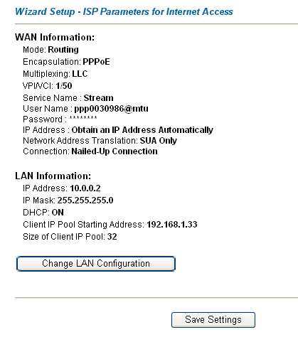 WAN у нас уже настроен, а в настройках LAN еще осталось ввести несколько параметров, поэтому нажимаем кнопку Change LAN Configuration. Перед нами появляется окно настройки LAN, где желательно выставить следующие параметры: