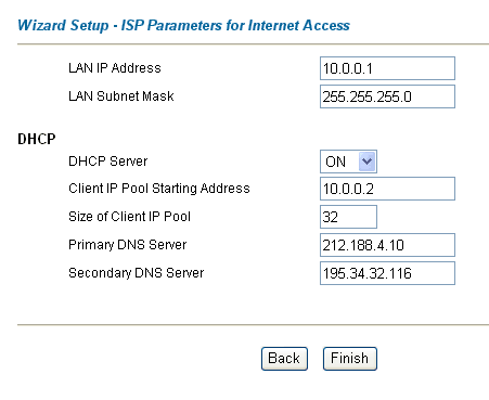 Вот и все. Далее нажимаем кнопку Finish и... И админская часть зависнет, потому что возникнет конфликт адресов (ведь у нас компьютер, с которого производится конфигурирование, пока еще имеет адрес 10.0.0.1, и этот же адрес мы поставили роутеру). Но ничего страшного, вам нужно сначала в настройках сетевой карты компьютера поставить получать IP-адрес и DNS автоматически (причем в дальнейшем такие же настройки должны быть сделаны на всех компьютерах локальной сети), после чего перезагрузить модем (выключить его и снова включить), ну а далее... Все, на всех компьютерах у вас есть Интернет. Больше ничего делать не нужно. Ну разве что снова вызвать админку (уже по адресу 10.0.0.1) и в Advanced Setup - Password изменить пароль по умолчанию на какой-нибудь ваш собственный.