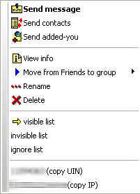 Как видите, в отличие от ICQ здесь есть несколько новых строк - мгновенные установки режима видимости/невидимости, занесение в игнор и копирование в буфер обмена UIN и IP контакта.