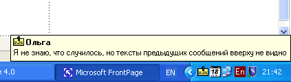 Еще один очень интересный момент... Вы можете разрешить системе (и это установлено по умолчанию) показывать пришедшие сообщения в виде подсказочек на иконке &RQ в области уведомлений. Для чего это нужно? Например, вы работаете, и у вас нет времени отвечать на сообщения в ICQ. Но при этом хочется знать, что же присылают - вдруг что-нибудь важное? Тогда вы просто краем глаза поглядываете на появляющиеся сообщения, не открывая основное окно, и если придет что-то важное - ну, тут уже можно открыть окно и ответить. Выглядит это так...