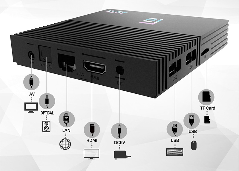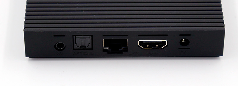 На задней стороне: AV-выход, оптический выход, Ethernet, HDMI, вход адаптера питания.