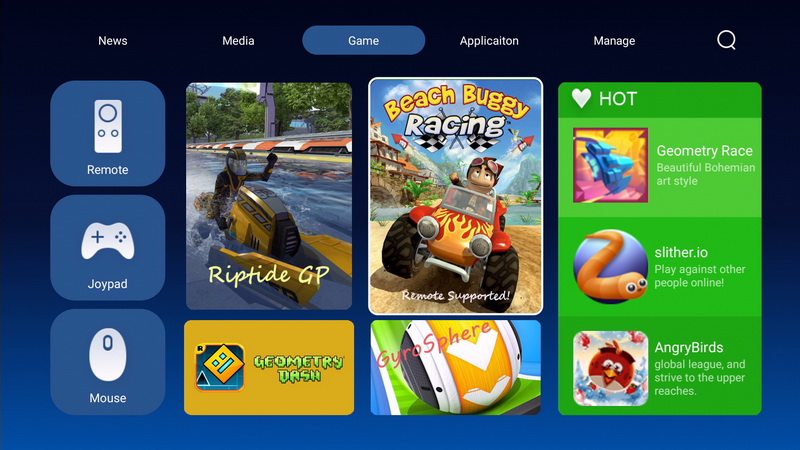Этот плеер также можно использовать в качестве игровой приставки. С пультом, правда, тут особо не разгуляешься, хотя в Google Play есть раздел "Пульт ДУ вместо джойстика", но никто не мешает заказать для этой (или любой другой) приставки недорогой беспроводной геймпад - типа вот такого.