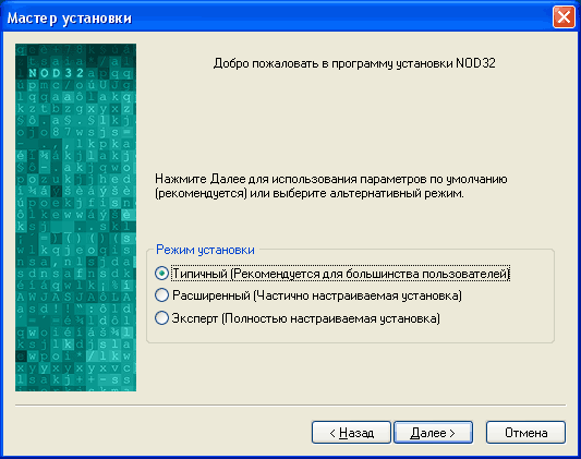 В процессе установки NOD32 сразу предлагает начать конфигурировать свои параметры под ваши задачи. На выбор дается несколько режимов: