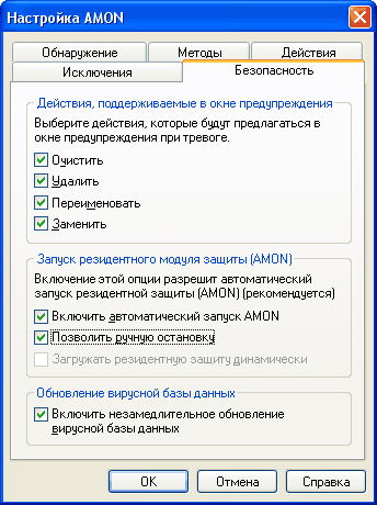 На этой вкладке вы можете задать список вариантов действий при тревоге (обычно имеет смысл оставить, например, только «Очистить» и «Удалить»), задать автоматическую загрузку монитора и незамедлительное обновление вирусной базы данных (вот незамедлительное обновление непременно нужно включить).