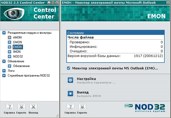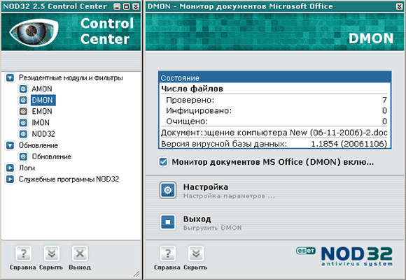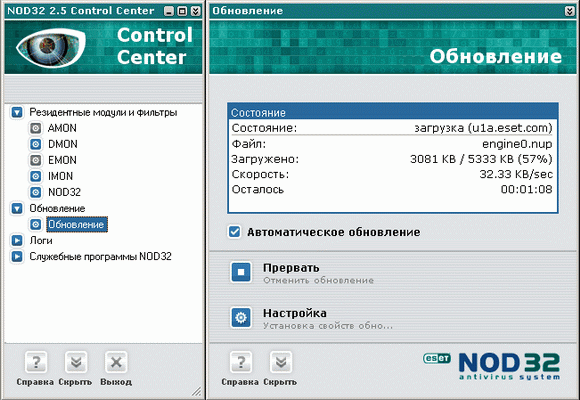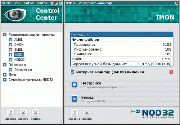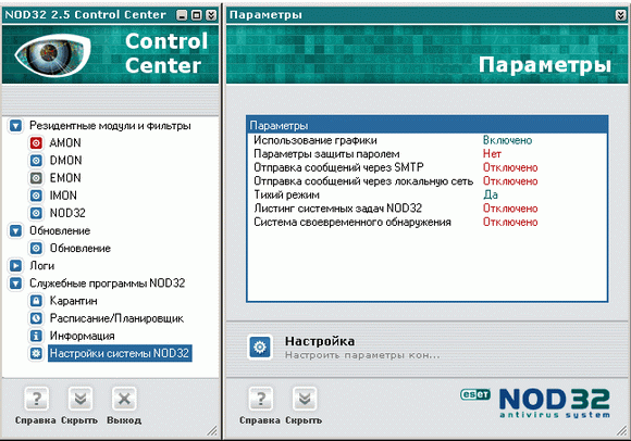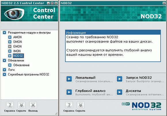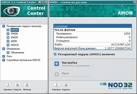 Во время инсталляции NOD32 прописывает свой вызов в параметры загрузки операционной системы. Загруженный NOD32 показывает свой значок в системной области уведомлений, и после щелчка по значку открывается окно центра управления антивируса: