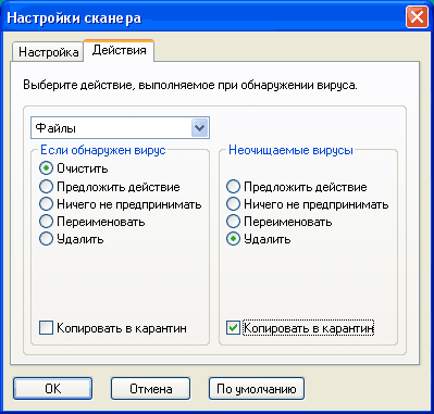 По умолчанию выставляется «Предложить действие», но я обычно предпочитаю и при сканировании выставлять такую же последовательность, как и в настройках монитора: очистить с копированием в карантин, а если очистка невозможна – удалить с копированием в карантин.