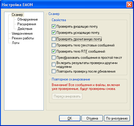 Монитор электронной почты обеспечивает проверку входящей и исходящей корреспонденции в почтовых клиентах Microsoft Outlook и Microsoft Exchange Extension. Он достаточно гибко настраивается – давайте посмотрим, что там предлагается: