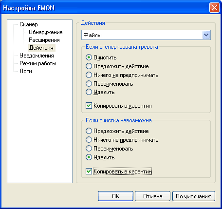Здесь лучше выставить те параметры, о которых мы уже говорили при настройке монитора проверки документов: при обнаружении вируса попробовать очистить, скопировав на всякий случай зараженное письмо в карантин, а если не удалось очистить, тогда удалить, скопировав оригинальное письмо в карантин.