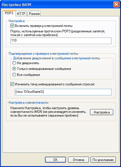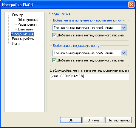 Это довольно важная настройка. Почтовый монитор умеет добавлять к теме инфицированного (и излеченного) письма специальную строчку, которая покажет вам, что письмо было заражено. Троян не может внедряться в обычный (plain) текст электронного письма, поэтому или прикладывается к письму в виде зараженного файла (выполняемого или архива), или внедряется в виде макроса в письмо формата HTML. Когда антивирус обнаруживает троян, он его уничтожает, оставляя только безопасную текстовую часть письма. Так как обезвреженное письмо почти всегда не несет никакой полезной информации, его можно, не читая, уничтожать средствами почтового клиента. Для этого и нужно добавлять специальную пометку в тему письма, по которой вы сможете сделать в почтовом клиенте правило (фильтр) – что-то вроде: «Если тема письма начинается со строчки "[virus]" – письмо удалить». Поэтому добавление уведомления лучше настроить так, как на рисунке.