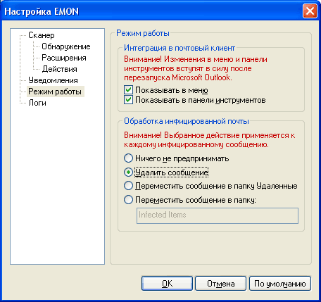 В настройке режима работы важен пункт «Обработка инфицированной почты». Я рекомендую зараженные письма вообще удалять, потому что даже вылеченные письма вам никак не понадобятся – их создают вирусы, а не люди. Впрочем, если вы по каким-то причинам хотите сохранять вылеченные письма, выберите настройку перемещения сообщения в специальную папку.