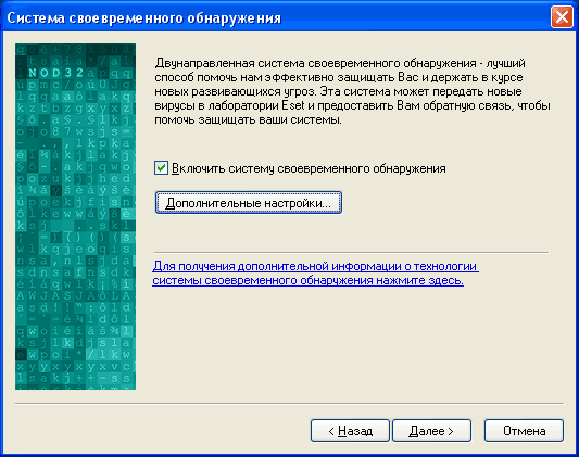 Система своевременного обнаружения – это обратная связь между вами и компанией-разработчиком. Если у вас на компьютере обнаруживается какая-то зараза, которую по тем или иным причинам фирма Eset хотела бы изучить, вам будет предложено отправить этот файл (или только прицепленный к нему вирус) в лабораторию фирмы – через Интернет, разумеется. На функциональность NOD32 включение или выключение этой системы никак не влияет, просто если ее включить, то вы становитесь как бы добровольным помощником разработчиков, и опыт, полученный компанией при анализе присланной вами заразы, может весьма пригодиться другим пользователям. Если вы не желаете, чтобы с вашего компьютера что-то отправлялось в лабораторию, – выключите систему своевременного обнаружения. Но даже если она будет включена, вы можете заставить систему запрашивать ваше подтверждение при каждой отправке.