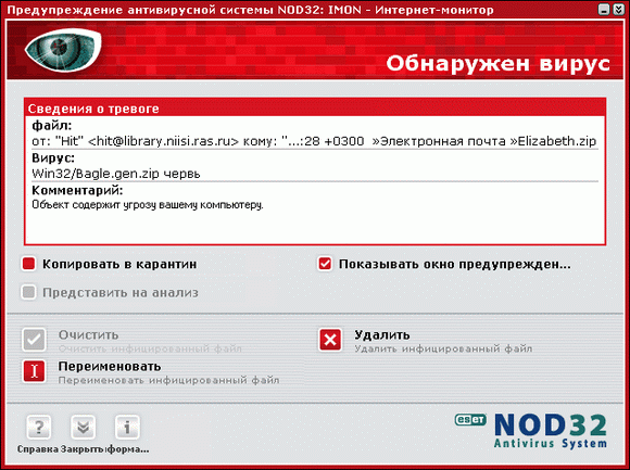 Когда монитор обнаружит в письме вирус, он выдаст вам примерно следующее сообщение: