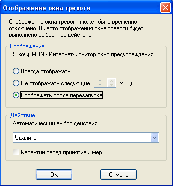 Совсем выключить окно предупреждений, как видно из рисунка, монитор не разрешает, однако можно скомандовать ему заткнуться по крайней мере до перезапуска компьютера. Инфицированные файлы (письма), как я уже говорил, лучше просто удалять.